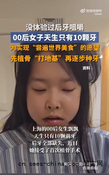【#00后女子天生只有10颗牙# ,为实现“尝遍世界美食”的愿望,攒钱踏上治疗之路】上海的00后女生飘飘天生只有10颗前牙,后牙全部缺失。近日,她接受了首次植骨手术。飘飘说自己从小仅用前牙咀嚼,直到18岁才被确诊“无后牙”。为实现“尝遍世界美食”的愿望,她攒钱踏上漫长的治疗之路。先植骨“打地基”,再逐步种牙,尽管术后脸肿、只能喝流食,飘飘仍笑着提醒大家爱惜牙齿。来源:荆楚网的微博视频