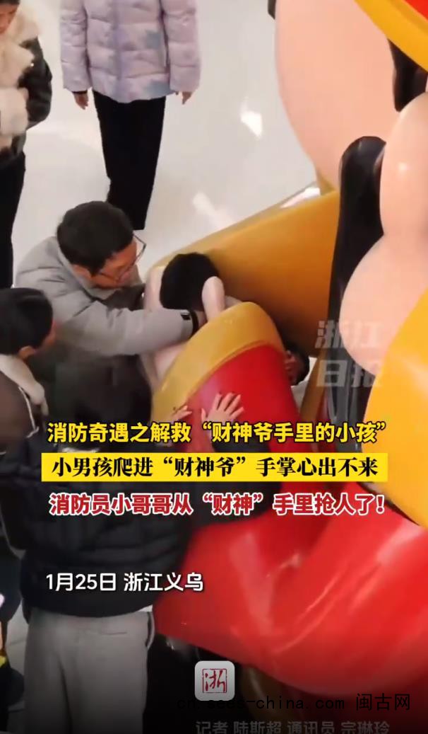 橙柿互动记者了解到,在义乌一家商场里,一小男孩钻到财神爷雕像里玩被卡住了。救援人员到商场后,家长说:“我们尝试了很多办法,还用了护手霜做润滑,但都没能成功,只好请你们来帮忙。”