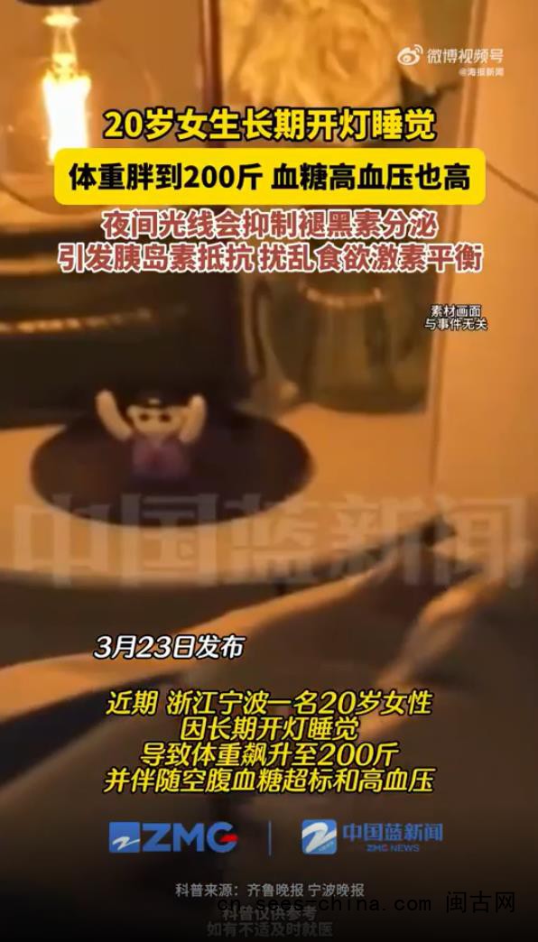 宁波大学附属康宁医院睡眠医学科副主任医师郑天明在门诊中就遇到过典型案例。“曾有个二十岁出头的小姑娘,体重200多斤,空腹血糖超过了14mmol/L,血压也高。一问生活习惯,是长期开灯睡觉的。”