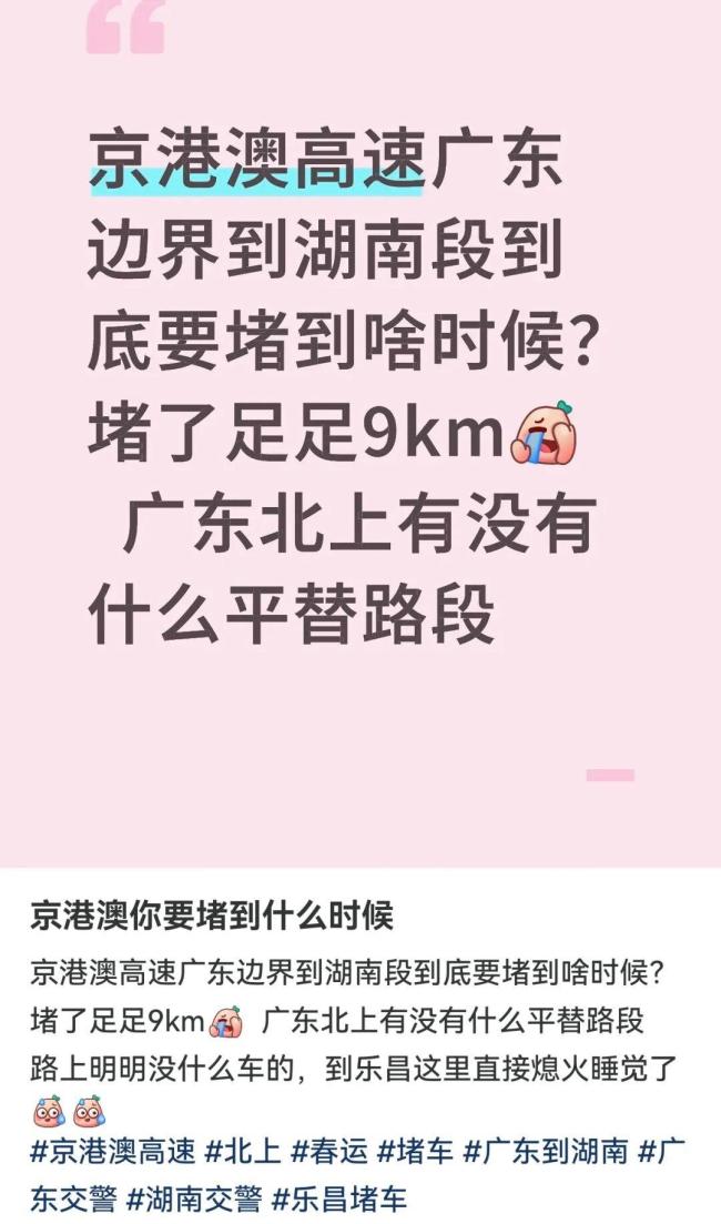 社交平台上,不少已自驾返乡的网友也表示遇到了严重的交通拥堵,有人甚至抱怨说“走了一天还没有出广东”,还有人提到不到30公里的路程堵了7个小时。看到这种情况,还没出发的网友纷纷寻求避堵攻略,也有热心网友给出意见。