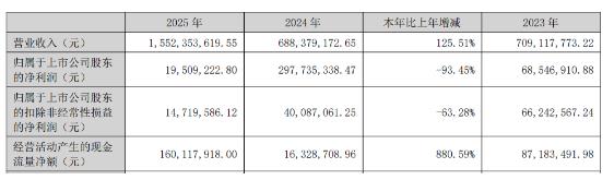 中国经济网北京4月22日讯 江天化学(300927.SZ)日前披露2025年年报显示,报告期内,公司营业收入为15.52亿元,同比增长125.51%;归属于上市公司股东的净利润为1950.92万元,同比下降93.45%;归属于上市公司股东的扣除非经常性损益的净利润为1471.96万元,同比下降63.28%;经营活动产生的现金 流量净额为1.60亿元,同比增长880.59%。