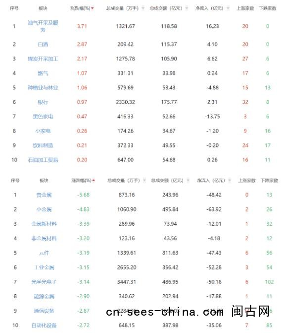 板块方面,油气开采及服务、白酒、煤炭开采加工等板块涨幅居前,贵金属、小金属等板块跌幅居前。