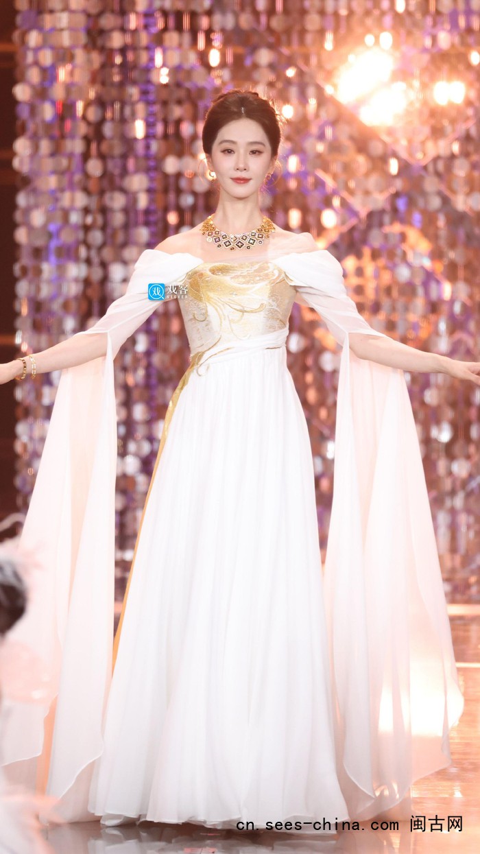 刘诗诗身穿一袭白色长裙,裙身剪裁利落,没有多余的装饰。她将头发盘起,露出优美的肩颈线条,耳畔点缀着简约的珠宝,整个人看起来像一尊白玉雕像——清冷、高贵、不容侵犯。