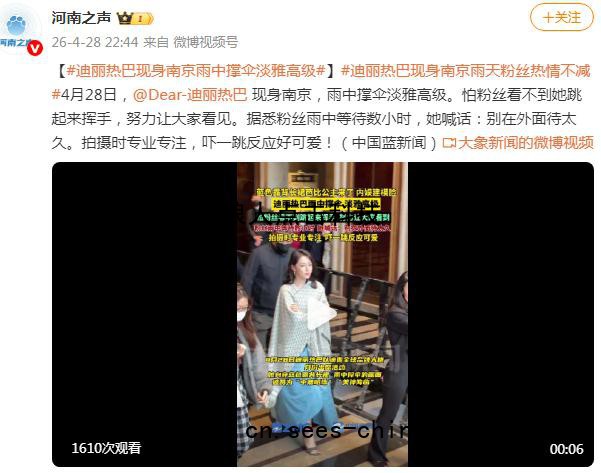 【#迪丽热巴现身南京雨中撑伞淡雅高级#】#迪丽热巴现身南京雨天粉丝热情不减#4月28日,@Dear-迪丽热巴 现身南京,雨中撑伞淡雅高级。怕粉丝看不到她跳起来挥手,努力让大家看见。据悉粉丝雨中等待数小时,她喊话:别在外面待太久。拍摄时专业专注,吓一跳反应好可爱!(中国蓝新闻)来源:大象新闻的微博视频